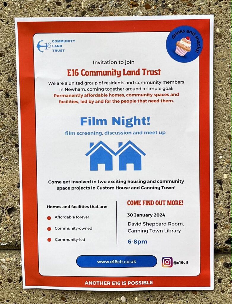 ? We will be showing the film ‘Homes and Hands’ about Community Land Trusts and how local people have come together to create community-owned facilities and housing that is always affordable. Then we will have a discussion about ways that our CLT can do the same for E16!
